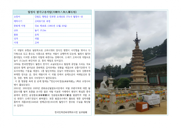 지정문화재 | 월정사 팔각구층석탑(月精寺八角九層石塔) 페이지 정보 작성자 평창문화원 작성일16-07-27 13:19 조회3,103회 댓글0건 이전글 다음글 목록 본문 국보 제48호 월정사 팔각구층석탑(月精寺八角九層石塔)사진을 클릭하면 크게 읽을 수 있습니다. 댓글목록 등록된 댓글이 없습니다. 이전글 다음글 목록
