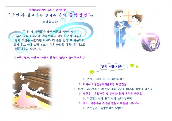 한여름 밤의 음악향연에 초대합니다. 페이지 정보 작성자 평창문화원 작성일16-08-10 06:04 조회3,912회 댓글0건 이전글 다음글 목록 본문 평창문화원에서 드리는 음악선물 초대장을 클릭하면 크게 보실 수 있습니다. 댓글목록 등록된 댓글이 없습니다. 이전글 다음글 목록