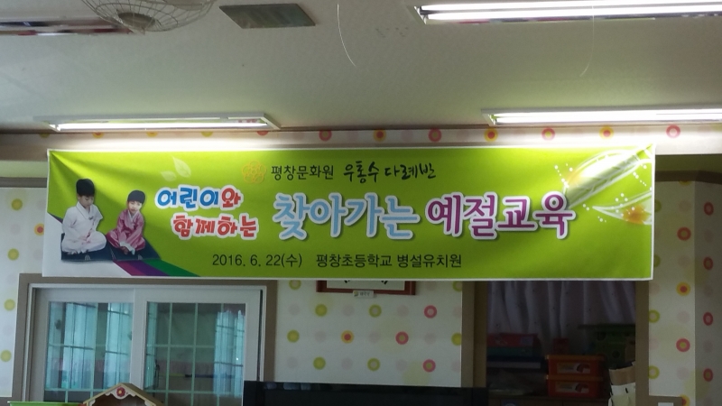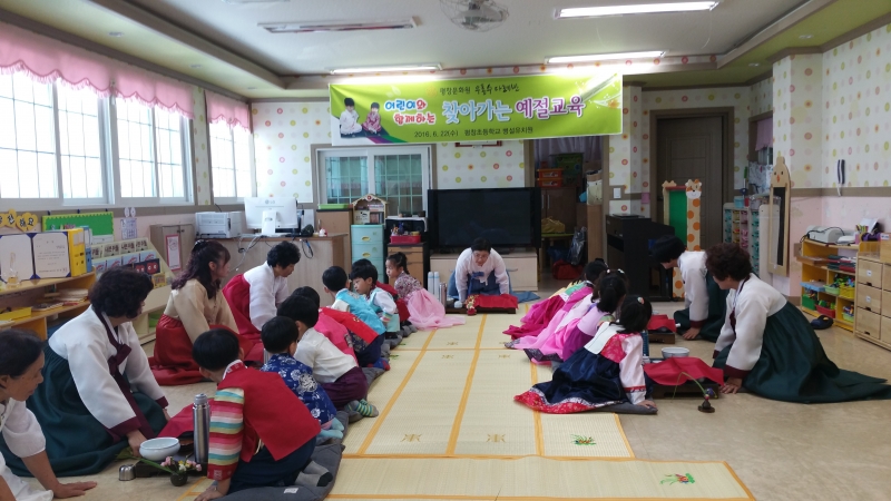 한국문화학교 | 찾아가는 예절교육 페이지 정보 작성자 평창문화원 작성일16-06-23 09:22 조회2,348회 댓글0건 이전글 다음글 목록 본문 2016. 06. 22(수) 평창문화원 우통수 다도반 선생님들이 평창초교 병성유치원 5~6세와 7세 원아를 대상으로 예절교육을 실시하였다.공수예절과 절하는 법차예절 등에 대하여 실시 어린이들의 표정이 매우 진지했다. 댓글목록 등록된 댓글이 없습니다. 이전글 다음글 목록