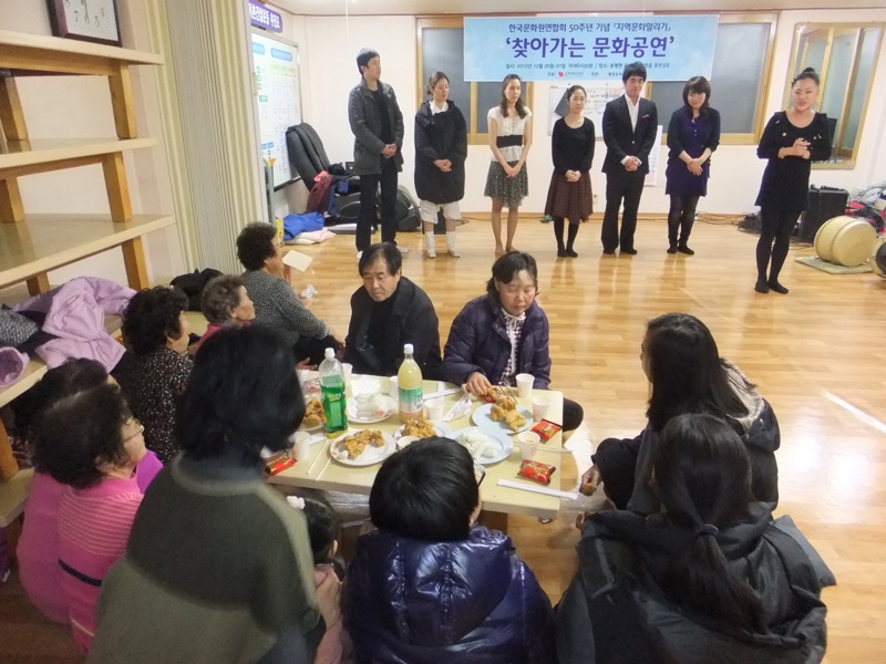 2012.12.20~21 용평면도사리, 평창읍 종부3리에 찾아가는 문화공연을 열었습니다. 극단 광대무변에서 뮤지컬과 미얄과장의 한 부분을 보여주고, 우리가 쉽게 접하지 못하는 판소리 공연도 선보였습니다.