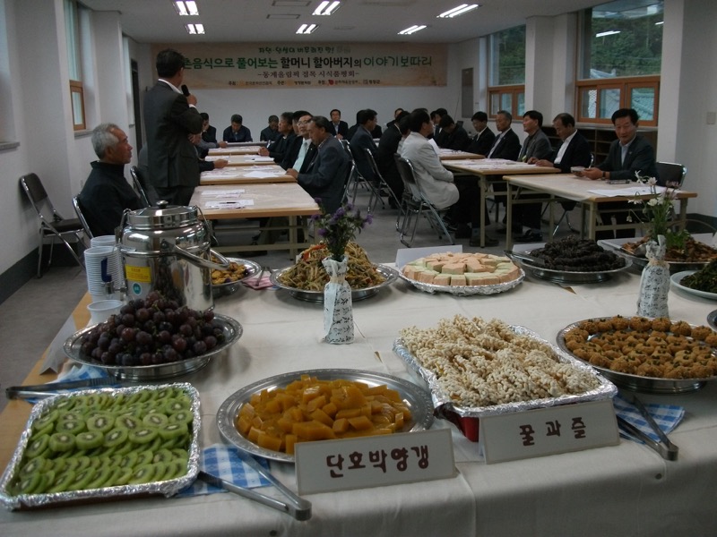 2011. 9. 22. 목요일 국비사업의 일환으로 "산촌음식으로 풀어보는 할머니 할아버지의 이야기보따리"프로그램 중 2018 평창동계올림픽을 겨냥하여 산촌음식 품평회를 군수님을 비롯 각 기관장님들을 모시고 진행하였습니다. 품평회 메뉴로는 삼색손두부, 꿩곤드레밥, 감자국수, 갓순대 등을 앙케이트로 조사하여 큰 관심을 끌었습니다.
