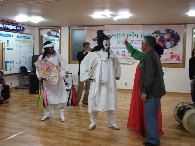 마을 어르신들과 주민들을 위해 극단 광대무변이 뮤지컬음악과 함께 노래를 부르고, 미얄과장이라는 봉산탈춤 공연도 해주셨습니다. 어르신들 모두 즐겁게 공연을 보시고 다음에 기회가 되면 또 해달라는 당부도 해주셨습니다.