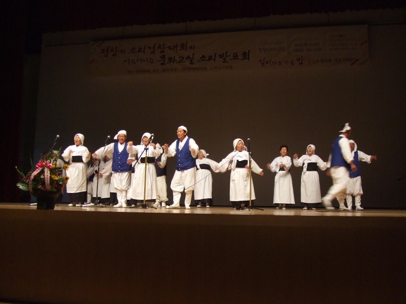 2008. 10. 30. 목요일 평창문화예술회관에서 제6회 소리경창대회와 문화학교 소리발표회를 열었습니다. 깊어가는 가을밤에 실버문화학교 3년연속 우수상 공연물인 평창아라리의 소리를 들려주셨습니다. 소리경창대회와 딱맞는 소리를 들으니 너무나 뜻깊은 시간이 되었습니다.