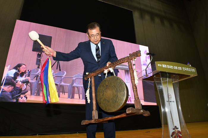 대회장이신 이욱환 평창문화원장님 징소리로 휘호 시작을 알리고...