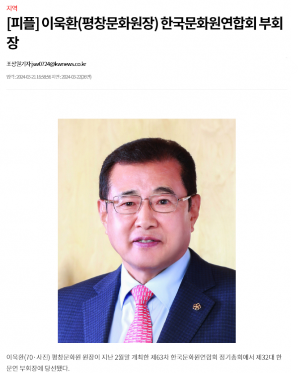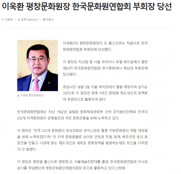 언론보도 스크랩 | 이욱환 평창문화원장 한국문화원연합회 부회장 당선기사 페이지 정보 작성자 평창문화원 작성일24-03-29 15:17 조회1,990회 댓글0건 관련링크 https://www.kado.net/news/articleView.html?idxno=1234752 972회 연결 https://www.kwnews.co.kr/page/view/2024032109471759287#google_vignette 865회 연결 이전글 다음글 목록 본문 강원도민일보, 강원일 댓글목록 등록된 댓글이 없습니다. 이전글 다음글 목록