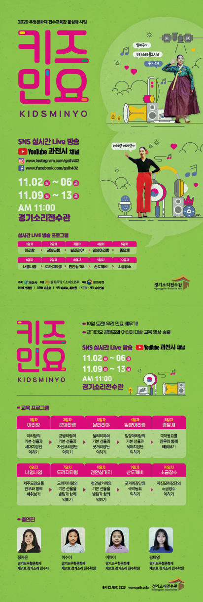 2020년도 무형문화재 전수교육관활성화사업 SNS실시간 라이브방송 ‘키즈민요 KIDSMINYO’ 페이지 정보 작성자 전은정 작성일20-10-26 10:52 조회1,911회 댓글0건 이전글 다음글 목록 본문 1 댓글목록 등록된 댓글이 없습니다. 이전글 다음글 목록