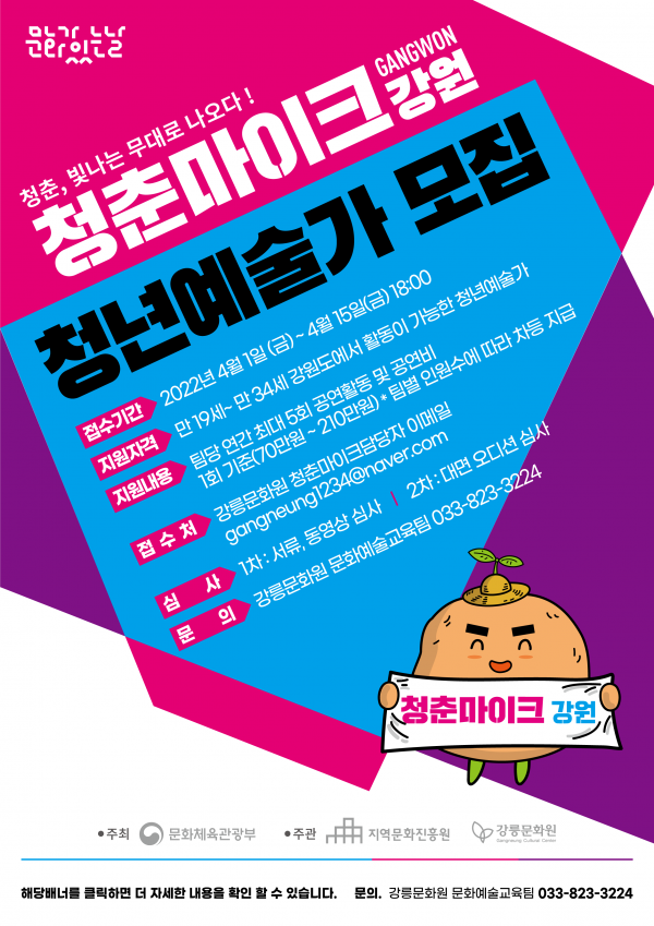 "강릉문화원 2022 문화가 있는 날 청춘마이크" 사업 홍보 페이지 정보 작성자 평창문화원 작성일22-04-04 11:38 조회1,643회 댓글0건 이전글 다음글 목록 본문 문화체육관광부에서 주최하고 지역문화진흥원과 강릉문화원에서 주관하는 "2022 문화가 있는 날 청춘마이크" 사업을 홍보하오니 많은 관심 바랍니다. 댓글목록 등록된 댓글이 없습니다. 이전글 다음글 목록