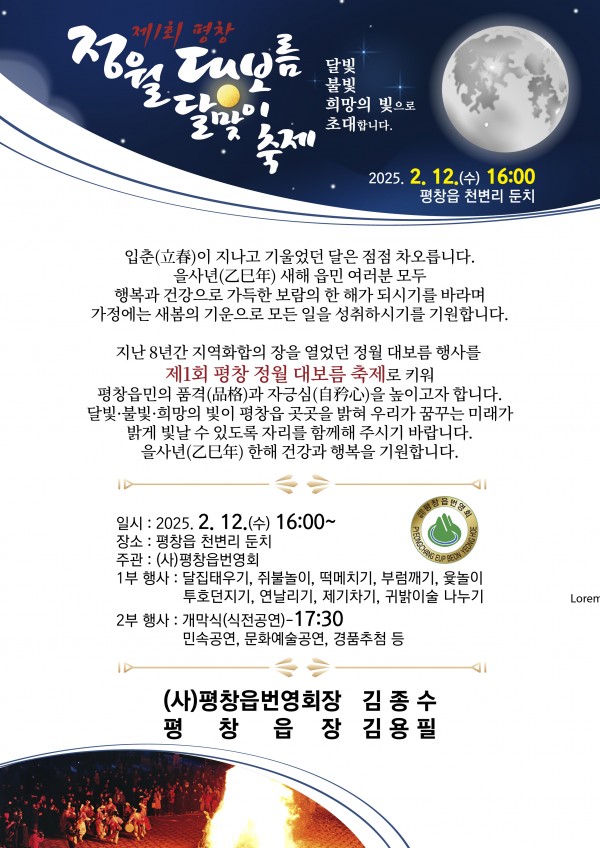 정월 대보름행사 안내(평창읍) 페이지 정보 작성자 평창문화원 작성일25-02-05 16:57 조회550회 댓글0건 이전글 다음글 목록 본문 정월 대보름행사 안내(평창읍) 댓글목록 등록된 댓글이 없습니다. 이전글 다음글 목록
